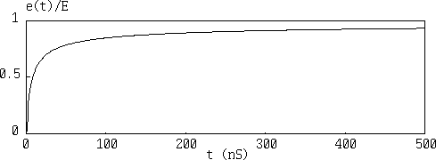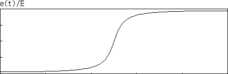 Here is a wave form of step pulse response when a 100 meter long coaxial cable (JIS C3501, 50 Ohm, 3.0 mm insulation diameter) is used. The wave form that rises up steeply first and then rises moderately is often seen as an exponential wave form of C-R charging circuits. However, since in transmission theory of electrical engineering, a condition that a secondary parameter under high frequency of cables is R << w*L, G << w*C holds good, the following approximation is very accurate (1).