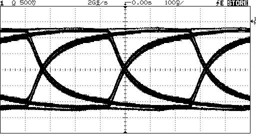 立ち上がりの遅い波形でランダムな信号を伝送すると、過去の履歴により波形のタ イミングがずれて、一種のジッタを生じますから、振幅と時間の2面から伝送波形 の劣化を評価することが必要で、この目的で良く使われるのが、「アイ・ダイアグ ラム」(eye diagram) です。